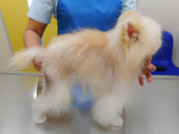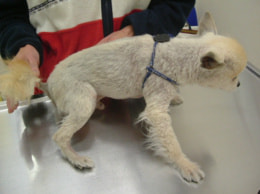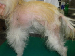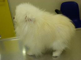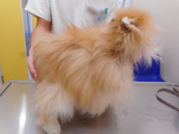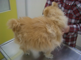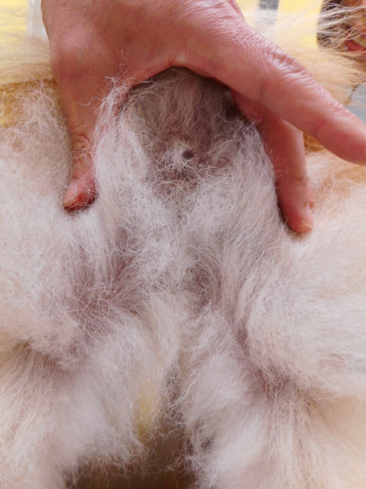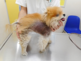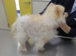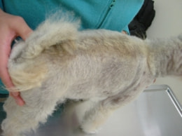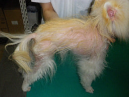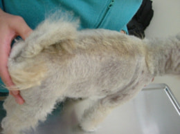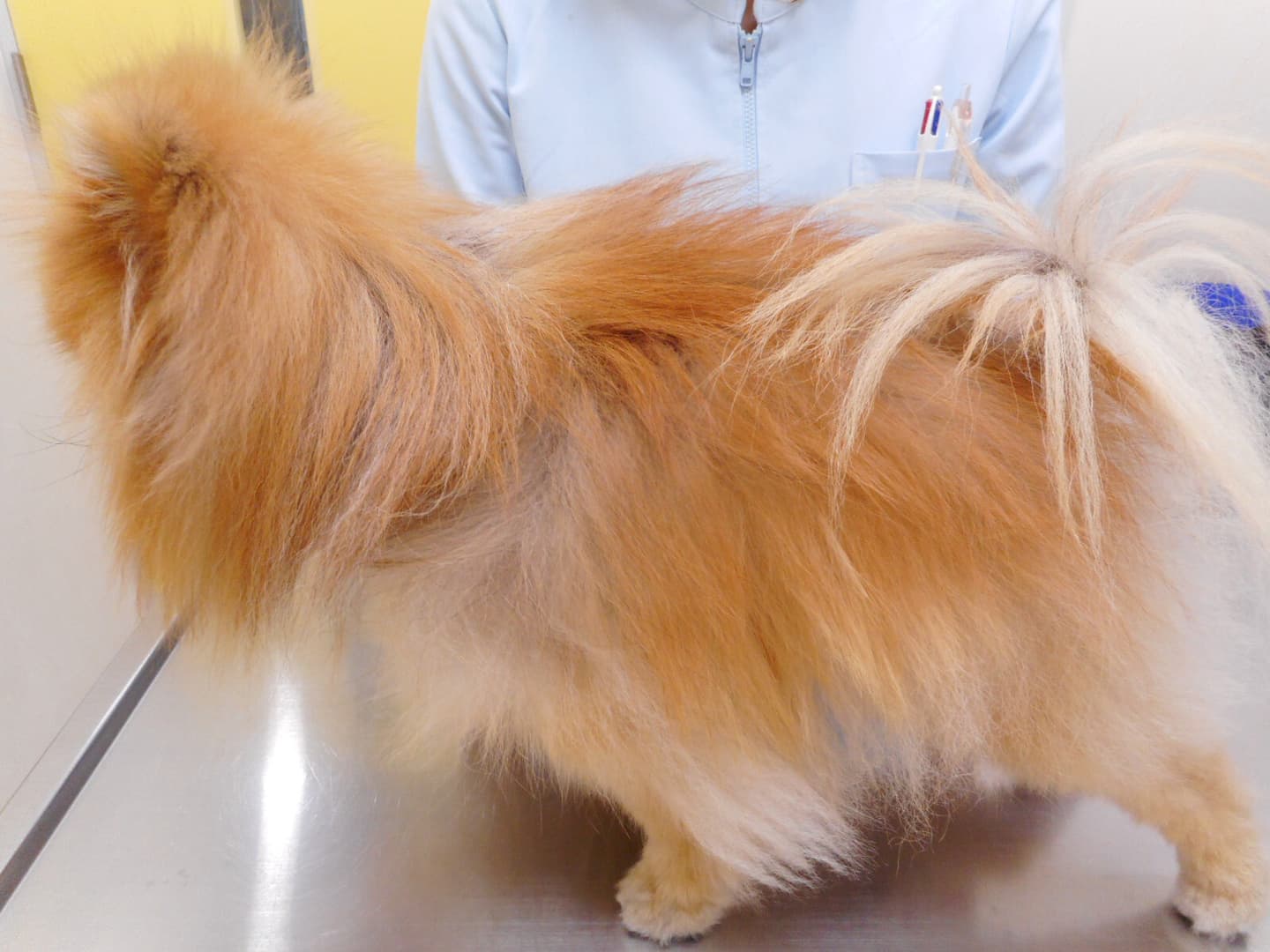 炎症や痒みはありませんが進行性に脱毛します。体幹部の毛が抜け、頭部と足先の毛は残ります。脱毛までいたらなくても昨年短く切った毛が全く伸びてこないことで疑われるケースも多いです。しっかりとした毛質がふわふわと子犬のように逆戻りしている場合も警戒する必要があります。
