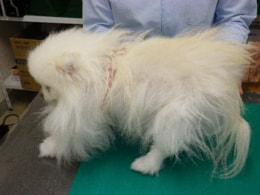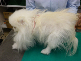 無治療でも寿命等には影響しませんが、毛並み豊かでふわふわだった子が地肌あらわに寂しくなっていく様に飼い主様はおおいに悩まれております。脱毛部の皮膚が黒ずんでしまった子では、治療に対し抵抗をしますので、そのような色素沈着が始める前に治療をお始めになることをおすすめいたします。